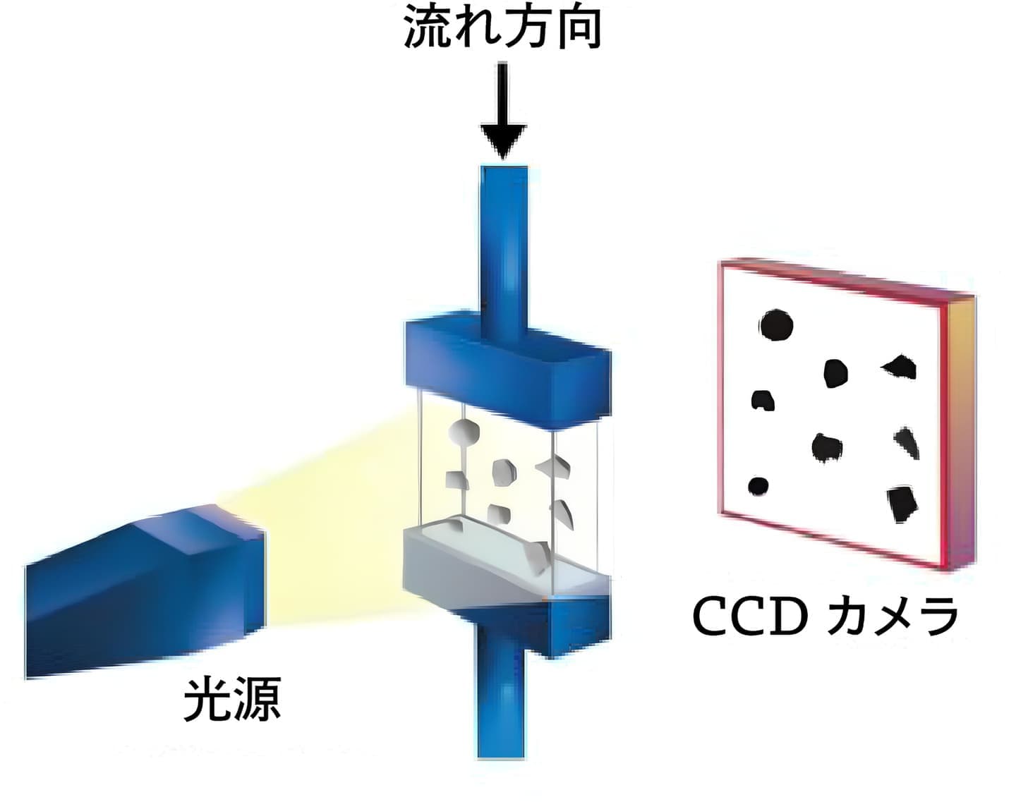 フローセルの一方には安定した照明光源が配置されており、セル全体を透過照明します。反対側には高性能レンズとデジタルカメラが設置されており、流れてくる粒子を連続的に撮像(撮影)します。この際、粒子は背景光に対して暗いシルエット(シャドウイメージ)として捉えられます。