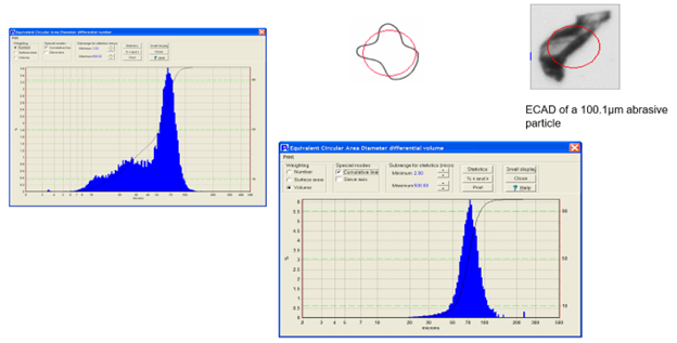 下図は、研磨粒子を対象とした数値加重および体積加重の粒子サイズ分布結果を示しています。