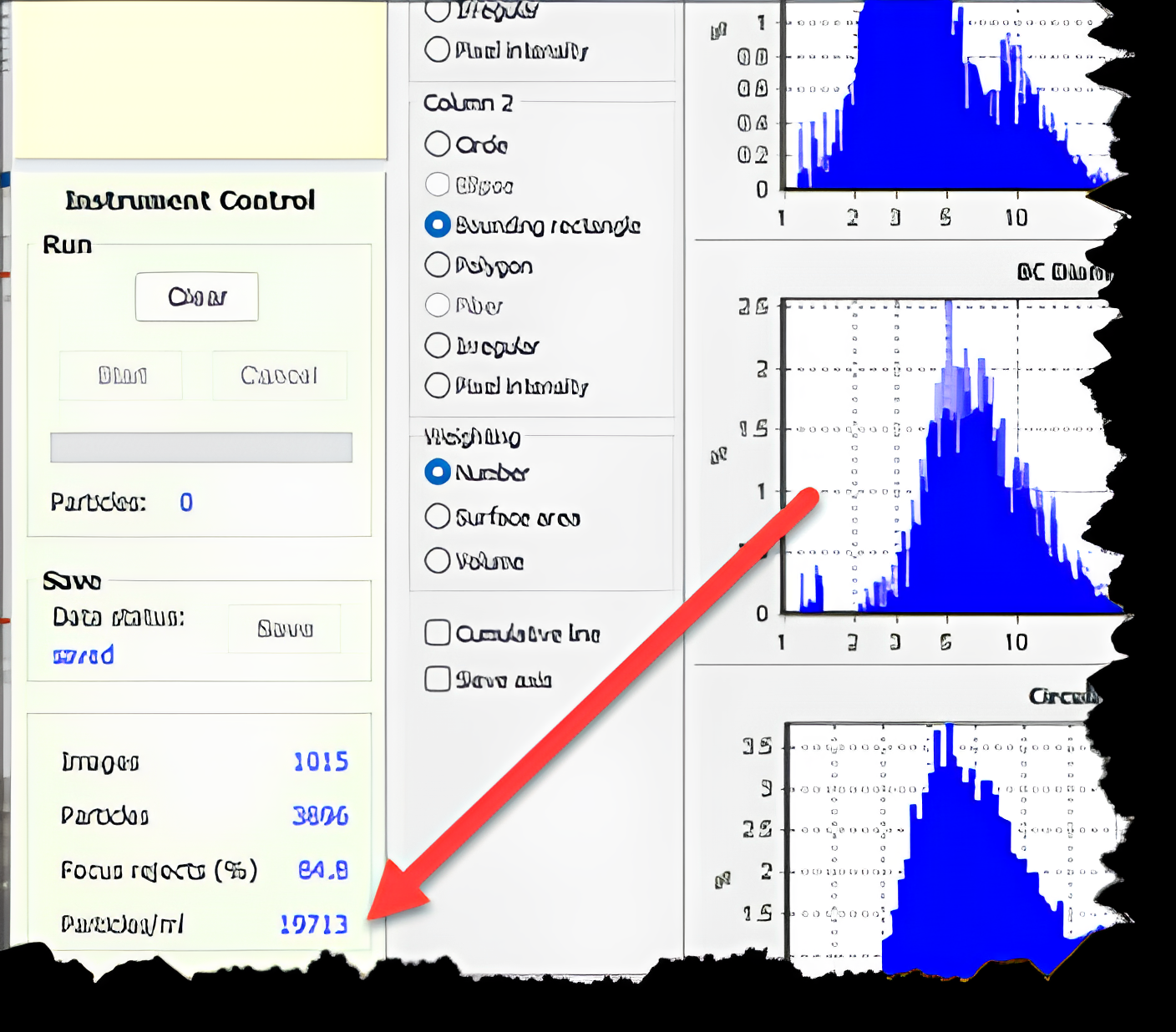 動的画像解析は、個々の粒子を直接測定するカウントベースの手法です。そのため、粒子サイズや形状だけでなく、粒子数および粒子濃度の測定が可能です。粒子濃度は1 mLあたりの粒子数としてリアルタイムで表示されます。