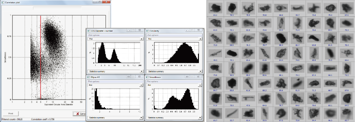 ・等価径(Area径 / Feret径) ・アスペクト比 ・円形度/形状係数 ・粗大粒子/異形粒子の検出 ・粒子数ベース濃度