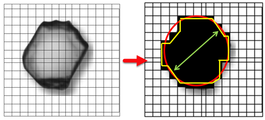 十分な倍率で撮像すると、粒子が画像上で大きく表示され、粒子の輪郭に割り当てられるピクセル数が増加します。粒子形状はこれらのピクセル情報を基に算出されるため、ピクセル数が多いほど解像度が向上し、形状解析の精度も高まります。