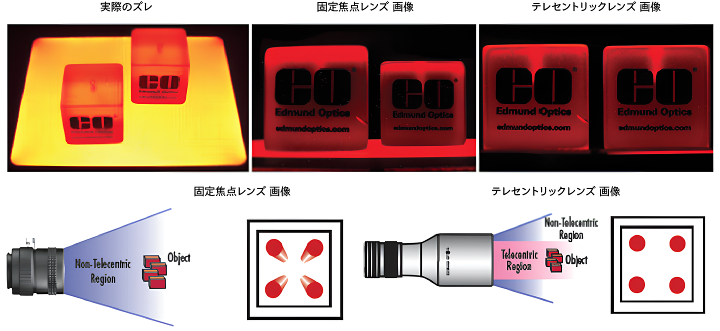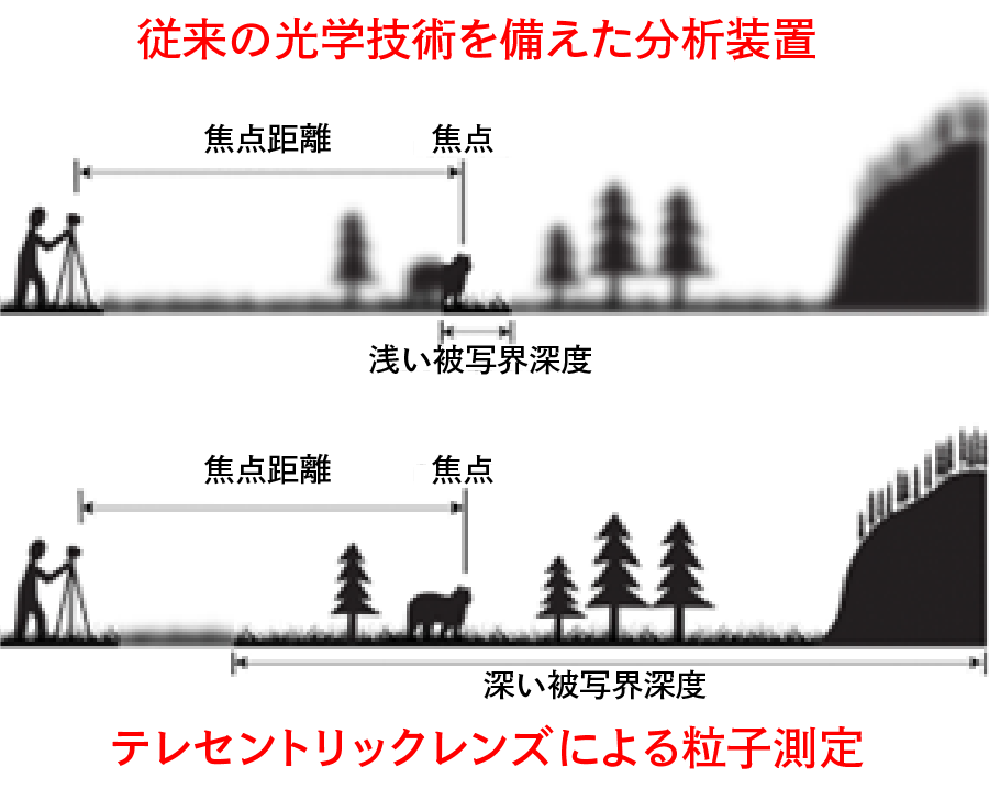 そのため、多くの高性能な動的画像解析装置では、テレセントリック光学系を採用しています。テレセントリック光学は、撮像範囲内で倍率が距離に依存しない特性を持ち、粒子が撮像面のどの位置や深さに存在していても、常に同一スケールで撮影することが可能です。