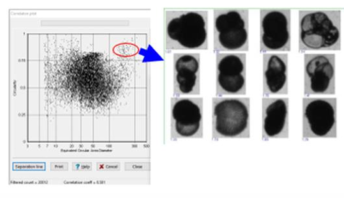 動的画像解析の非常に重要な特長の一つは、統計的に疑わしい粒子を実際の画像として確認できる点にあります。